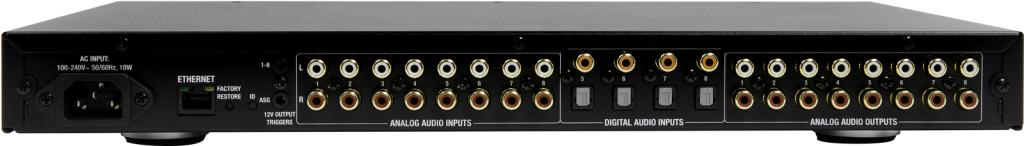 Triad 8 × 8 přepínač Audio Matrix. Zahrunje RCA, digitální coax, digitální optické vstupy pro integraci jakéhokoliv virtuálního zdroje zvuku.