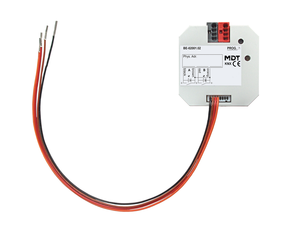 Univerzální rozhraní MDT BE dělá z běžných tlačítek, spínačů, oken a pomocných kontaktů "chytré" kontakty pro KNX. Komplexní aplikace poskytuje vhodné parametry pro širokou škálu aplikací. K dispozici jsou verze pro plovoucí kontakty a 230 V AC.