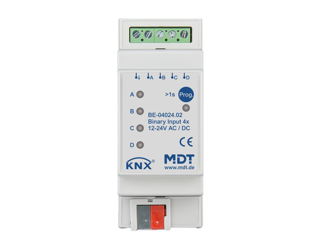 Díky MDT Binary Input BE jsou například běžná tlačítka, spínače, okenní a pomocné kontakty "chytré" pro KNX. Komplexní aplikace poskytuje vhodné parametry pro různé aplikace. K dispozici jsou verze pro plovoucí kontakty, 24 V AC/DC a 230 V AC.