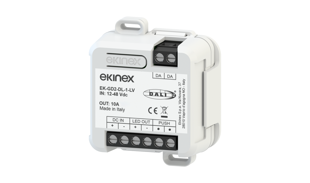 Jednokanálový stmívač DALI-2 EK-GD2-DL-1-LV umožňuje řídit jas nízkonapěťových LED zdrojů od 12 do 48 Vss pomocí PWM stmívání. Vstup sběrnice DALI-2 s referencí IEC 62386. Dynamické řízení teploty bílé TW DALI DT8, 2 nezávislé kanály (2 adresy DALI) nebo jeden kanál DALI DT6. Funkce lze nastavit pomocí přepínače. Sběrnicový vstup DALI-2 referenční IEC 62386.