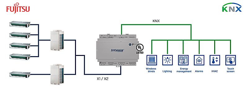 Aplikace Fujitsu byla speciálně navržena tak, aby umožňovala obousměrné ovládání a monitorování systémů Fujitsu VRF z instalace KNX. Řešení umožňuje integraci až 16 vnitřních jednotek z jediného rozhraní.