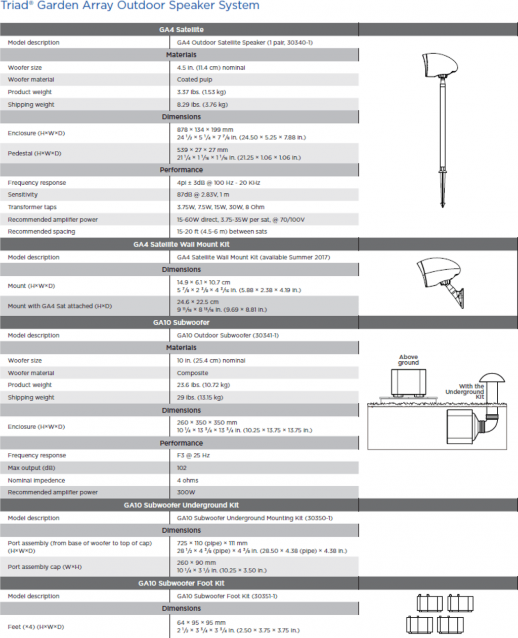 The Triad Garden Array is a family of premium, all-weather landscape speakers that are the perfect combination of elegance, sound, and durability. This family includes the unique GA4 Satellite and powerful GA10 Subwoofer speakers, and are designed to be placed throughout flowerbeds or around the yard blanketing outdoor spaces with rich, beautiful audio. Triad Garden Array speakers are completely scalable for every outdoor listening experience, from courtyards and patios to entire residential estates.