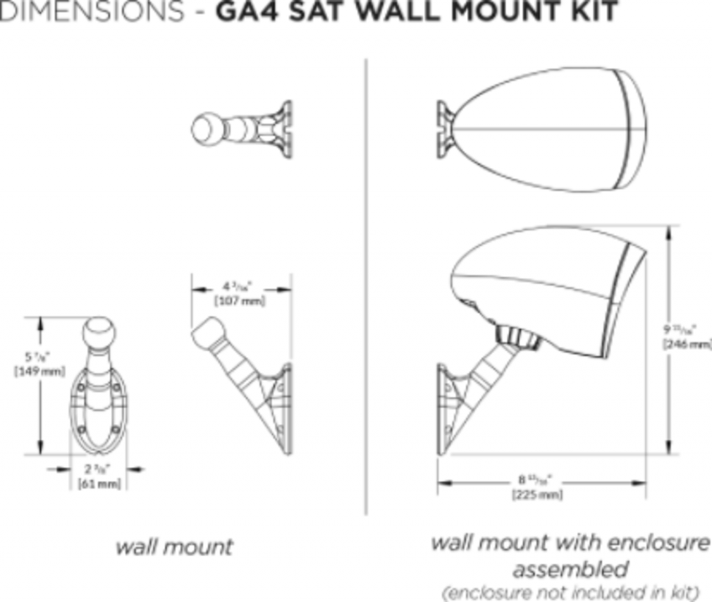 The GA4 Satellite Wall Mount Kit contains two wall mounts designed to be used exclusively with the Triad Garden Array GA4 Satellite speakers. The wall mount is used in place of the mounting pole and stake to surface mount the speaker to outdoor hardscape surfaces and allows the speaker to tilt and pivot for precise positioning.