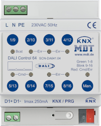 MDT DALI Control 64 Gateway tvoří rozhraní mezi sběrnicí KNX a DALI. Umožňuje například spínání a stmívání stávajících světel DALI pomocí skleněných nebo plastových tlačítek MDT. Brána podporuje světla/předřadníky kompatibilní s DALI a DALI-2, od jednobarevných přes laditelné bílé až po RGB(W).
