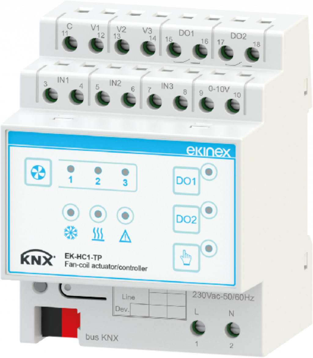 běrnicové zařízení KNX s funkcí akčního členu (v kombinaci s regulátorem pokojové teploty KNX) nebo regulátor/akční člen (se snímáním hodnoty teploty čidlem KNX nebo čidlem připojeným k analogovému vstupu). Pro instalace ve 2 nebo 4trubkových hydraulických rozvodech s ovládáním ON / OFF jednoho nebo dvou elektrotermických pohonů pro uzavírací ventily; ovládání 3rychlostního ventilátoru nebo 0-10 V ovládání ventilátoru s bezkartáčovým motorem. Výstupy, které se nepoužívají pro ovládání jednotky ventilátoru, lze nakonfigurovat jako výstupní kanály pro provádění jiných aplikací. Montáž do rozváděče na lištu podle normy EN 60715 (4 modulární jednotky, každá 18 mm). K použití v instalacích KNX pro automatizaci domů a budov.