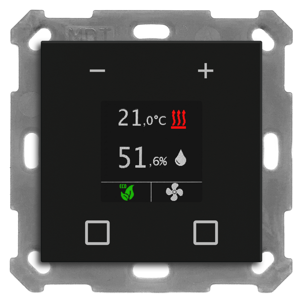 Regulátor pokojové teploty MDT Smart 55 s integrovaným čidlem teploty a vlhkosti slouží k regulaci teploty ve vnitřních prostorách. Regulátorem pokojové teploty lze ovládat spínací/topné akční členy spolu s tepelnými akčními členy nebo motorovými akčními členy KNX. Kromě toho má regulátor pokojové teploty MDT Smart 4 binární vstupy pro připojení plovoucích kontaktů.