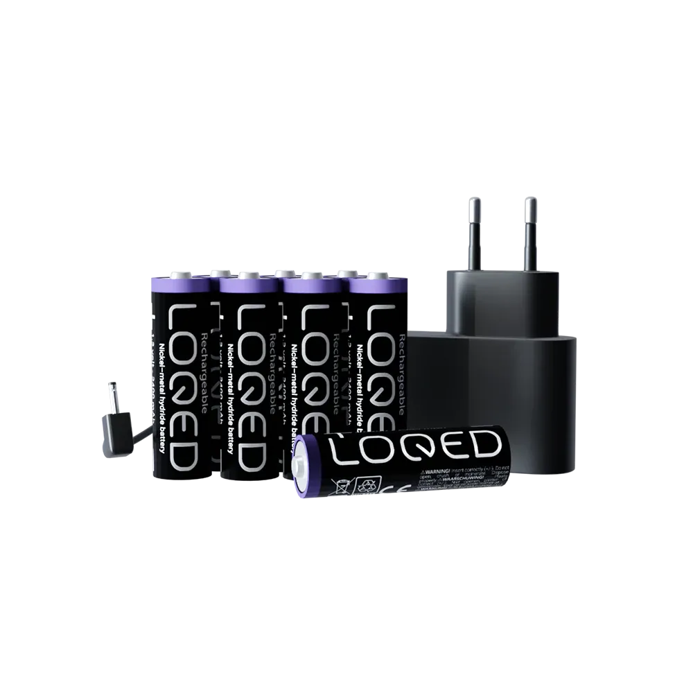 Rozlučte se s jednorázovými bateriemi. Napájejte svůj inteligentní zámek LOQED Touch pomocí 8 dobíjecích baterií AA, třímetrového kabelu a snadno použitelného adaptéru.