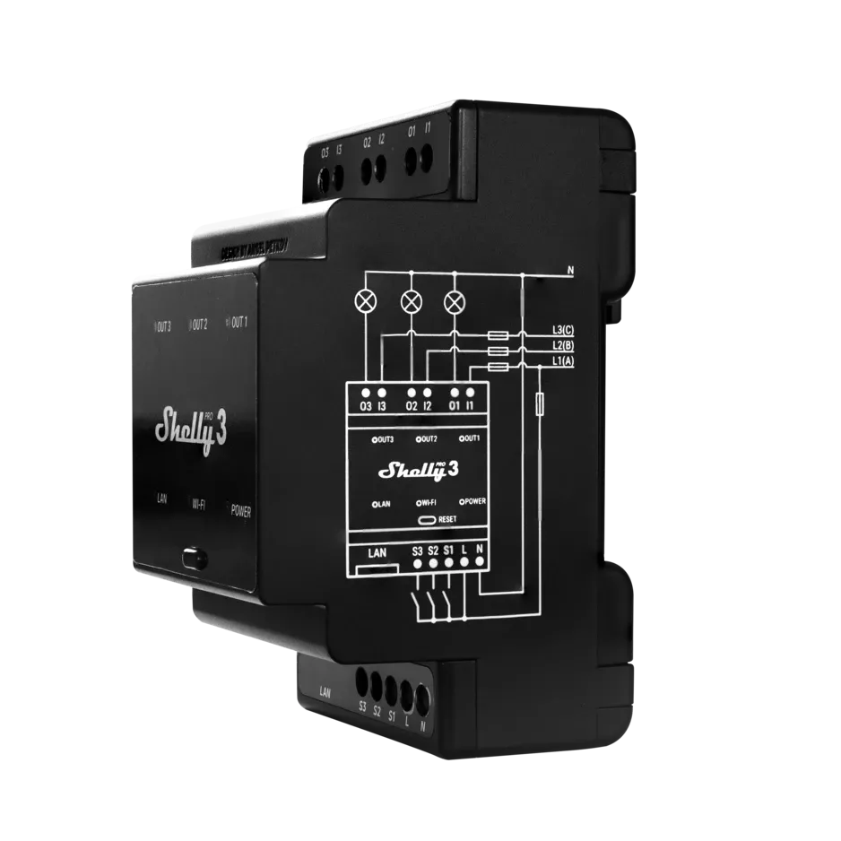 Shelly Pro 3 je třífázové, tříkanálové relé podporující až 48 A pro profesionální automatizaci světel a spotřebičů pro obytné nebo komerční použití. Je vybaveno bezpotenciálovými výstupy (beznapěťové kontakty), které nabízejí vysokou flexibilitu při podpoře napětí a aplikací. Lze nastavit různé typy akcí, scénářů a plánů a synchronizovat tak prostředí s každodenními činnostmi nebo obchodními potřebami. Shelly Pro 3 má navíc funkce skriptování pro vlastní automatizační scény na základě externích dat nebo různých událostí.