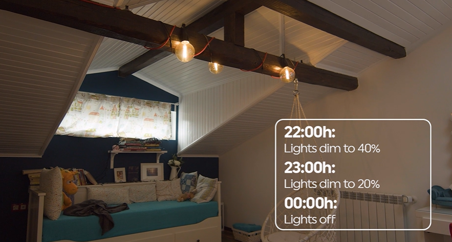 Stmívač Shelly Plus 0-10V lze bez námahy sladit s vaší každodenní rutinou. Vezměte v úvahu čas spánku: Mnoho dětí raději usíná při rozsvícených světlech. Můžete nastavit rozvrhy, které v průběhu jedné hodiny jemně ztlumí světlo v místnosti, než se úplně vypne. Tímto způsobem bude malý človíček pohodlně usínat a žádná energie nepřijde nazmar!