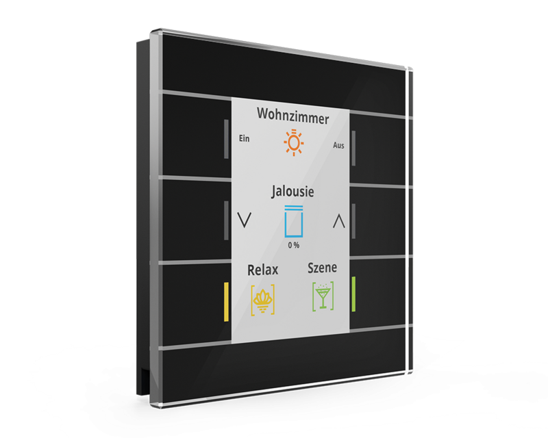 Tlačítko Glass Push-button II Smart má velký barevný aktivní displej, který indikuje funkci a stav. Lze parametrizovat až 12 funkcí na 2 nebo 3 úrovních (2x6 nebo 3x4 funkce). Skleněné tlačítko Glass Push-button II Smart lze použít také jako 6násobné tlačítko bez úrovní funkcí.