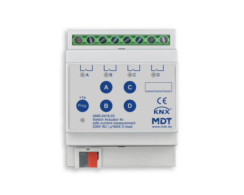 Standardní verze spínacího akčního členu MDT AMS 16 A s měřením proudu spolehlivě měří proudy na kanál až do 16 ampér. Díky tomu je možné například sledovat překmit zátěže a podkmit zátěže. Měření proudu na kanál lze zohlednit v celkovém měření proudu.
