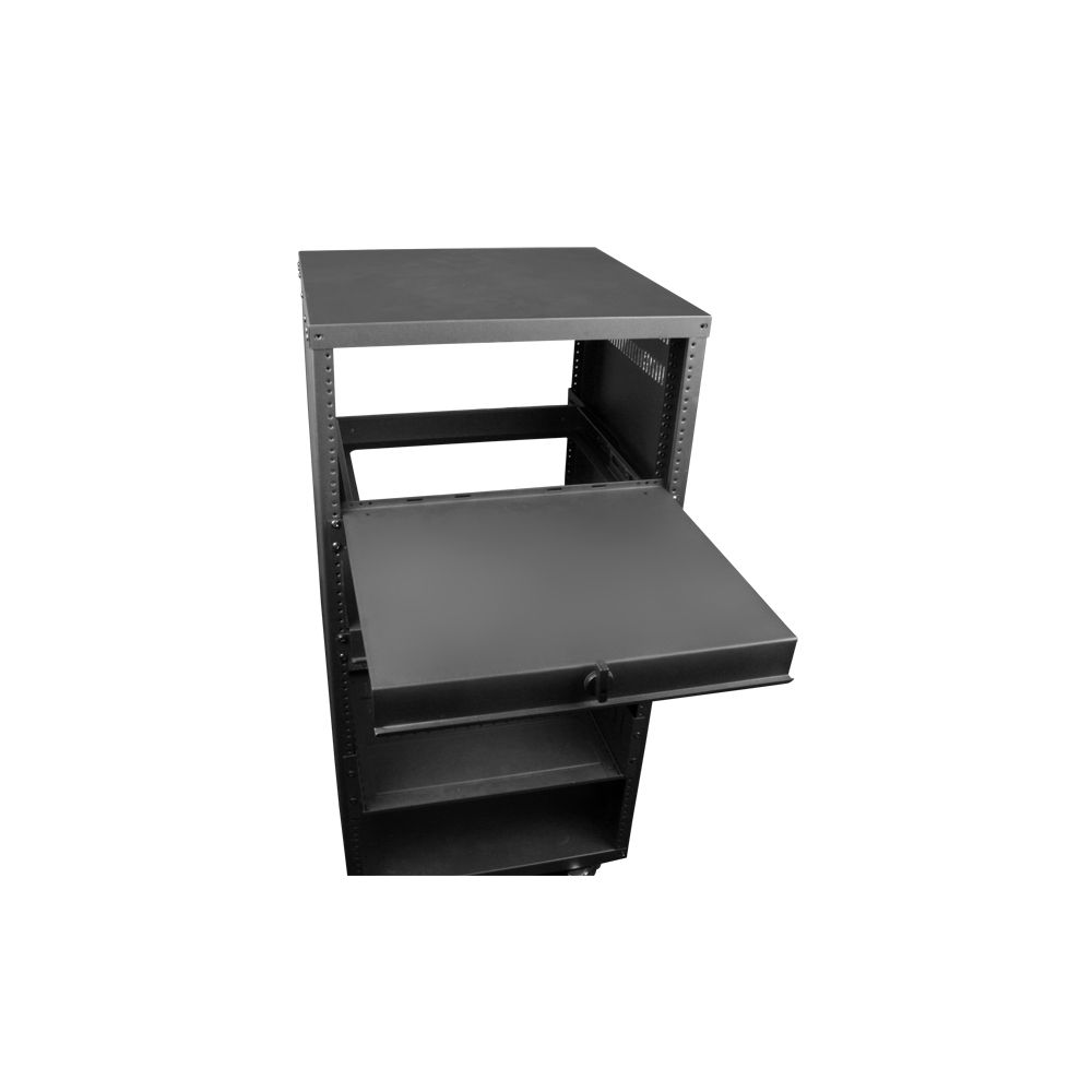 Posuvná police Strong™ zvyšuje univerzálnost vašeho stojanu na zařízení tím, že poskytuje vyhrazený pracovní prostor pro klávesnici, myš nebo jen pohodlné místo pro otevření nových disků Blu-Ray! Pro větší pohodlí je police během používání uzamčena západkou na přední straně.