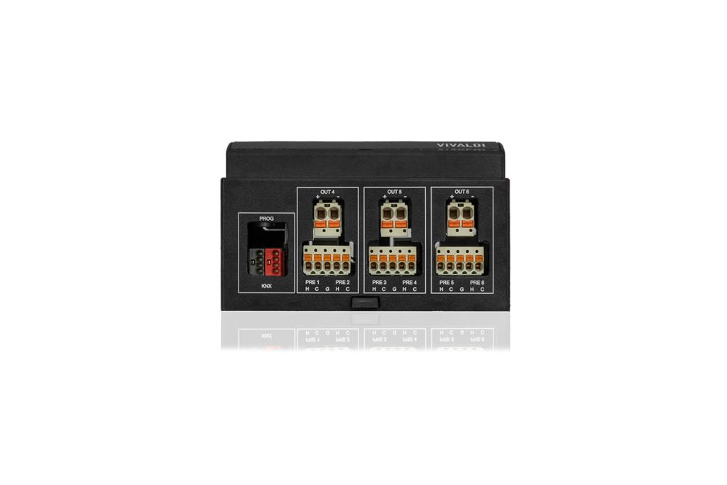 • 6 symetrických předzesilovacích výstupů linkové úrovně pro rozšíření počtu reproduktorů nebo výkonové zóny pomocí externích zesilovačů (##Vivaldi Multimedia E30S#, ##Vivaldi Multimedia E80S#, Vivaldi PMA , Vivaldi PSA series power amplifiers, Vivaldi active subwoofer, Vivaldi active speakers).