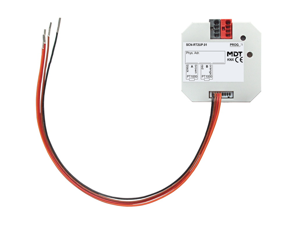 Regulátor teploty MDT se používá pro univerzální aplikace regulace teploty. Teplota je přijímána jako objekt KNX nebo přímo z připojených teplotních čidel PT1000.