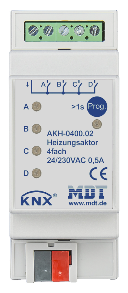 MDT Heating Actuator AKH má integrovaný PI regulátor pro ohřev a chlazení každého kanálu. Pro řízení vytápění přijímá aktor teplotu v místnosti například z tlačítka MDT nebo z detektoru přítomnosti s teplotním čidlem; není nutné používat externí regulátor teploty. Na každý z nenosných výstupů lze připojit a ovládat až 4 elektrotermické aktuátory 230 V AC (3 x 24 V AC).