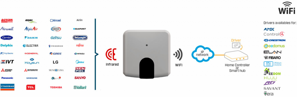 Univerzální infračervená brána umožňuje úplnou a přirozenou integraci jakékoli klimatizační jednotky (s infračerveným přijímačem) do systémů domácí automatizace založených na protokolu IP. Díky funkci automatického učení je možné infračervené dálkové ovládání automaticky identifikovat pouhým odesláním příkazu směřujícího na zařízení.